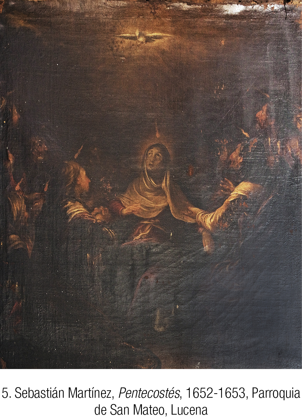 De los seis lienzos conservados, el que mejor refleja la personalidad de Sebastián Martínez es el dedicado a la Pentecostés, pues, a pesar de su evidente deterioro, parece libre de repintes [5]. En esta abigarrada composición aparecen algunos de los tipos más característicos del giennense, construidos con su típica pincelada deshecha y filamentosa y ese peculiar estilo «anieblado» que ya ponderaba Palomino (1724: 362). Su habilidad a la hora de plantear los contrastes lumínicos le permite fijar la atención en la figura sorprendida de María, verdadero foco de luz dentro del cuadro; en torno a ella se arremolina todo el colegio apostólico, que contempla atónito la llegada del Espíritu Santo y la aparición de las lenguas de fuego sobre sus cabezas.