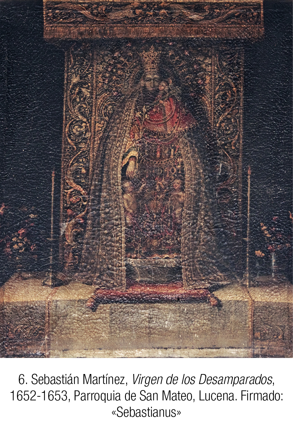 Otra de las obras mejor conservadas es la Virgen de los Desamparados, aunque paradójicamente es una de las que menos aporta al conocimiento de la obra de Martínez por tratarse de una pintura devocional [6]. Seguramente fue realizada a partir de algún grabado o pintura suministrado por el comitente, quien poseía un cuadro de este mismo asunto en su oratorio (García, 2015: 1.342). El pintor representó con suma minuciosidad el aspecto que entonces ofrecía esta imagen gótica en su altar barroco, completamente cubierta de joyas y textiles y cobijando bajo su manto la pareja de niños inocentes que dan nombre a su advocación. Curiosamente, los candeleros que flanquean la imagen son los mismos que aparecen representados en otra pintura firmada por Tomás Yepes en 1644, conservada en el monasterio de las Descalzas Reales de Madrid (Pérez, 1992: 153), aunque aquí la composición se ha enriquecido con los jarrones florales de los extremos, que añaden algún detalle de naturaleza muerta de cierto interés.