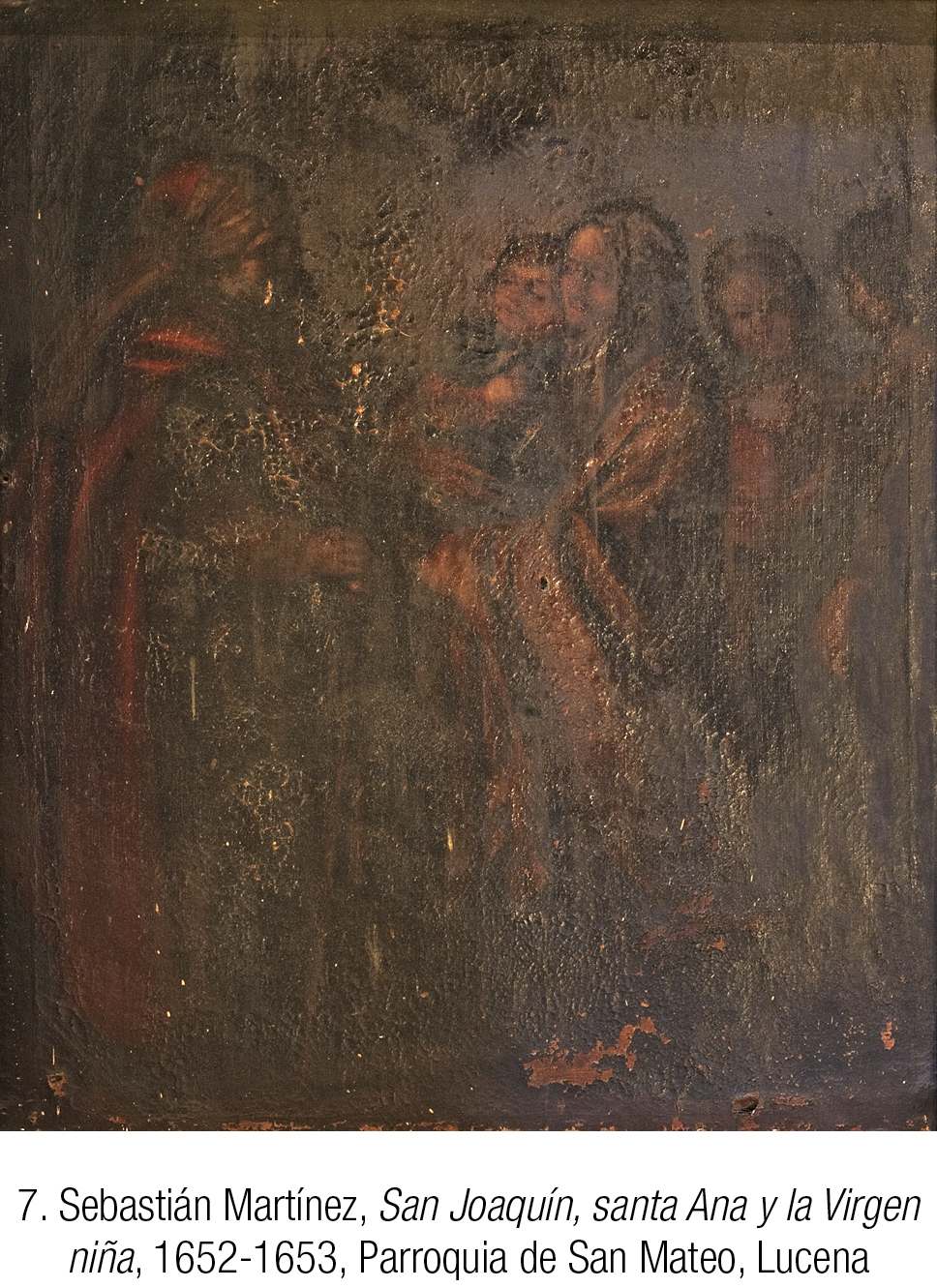 Mayor entidad tuvo que ofrecer en su día la pintura de San Joaquín, santa Ana y la Virgen niña, aunque el oscurecimiento de los barnices y las pérdidas de materia pictórica lo hacen hoy prácticamente irreconocible [7]. El estilo de Martínez todavía se adivina en el férreo dibujo de las figuras y el plegado lineal de las telas. A la izquierda de la composición se aprecia la figura de Joaquín, ataviado con la típica indumentaria orientalizante, mientras que dos figuras femeninas dialogantes asoman por la derecha y la madre de la Virgen se sitúa en el centro, sosteniendo a la niña en sus brazos.