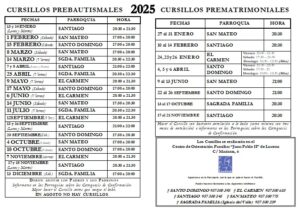El calendario para la realización de los cursillos prebautismales y prematrimoniales es de carácter anual. Los interesados deberán inscribirse en la parroquia correspondiente. Todos los cursillos se imparten en las instalaciones del COF de la Campiña San Juan Pablo II.