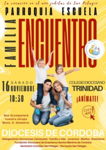El próximo sábado 16 de noviembre se celebrará en Córdoba una nueva edición del Encuentro Familia-Parroquia-Escuela organizada por las delegaciones diocesanas de Catequesis, Familia y Vida, Juventud, Medios de Comunicación, Enseñanza y la Fundación Diocesana “Santos Mártires de Córdoba” al que estamos invitados familias, sacerdotes, catequistas y todos los fieles de nuestra Diócesis.